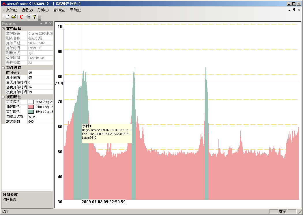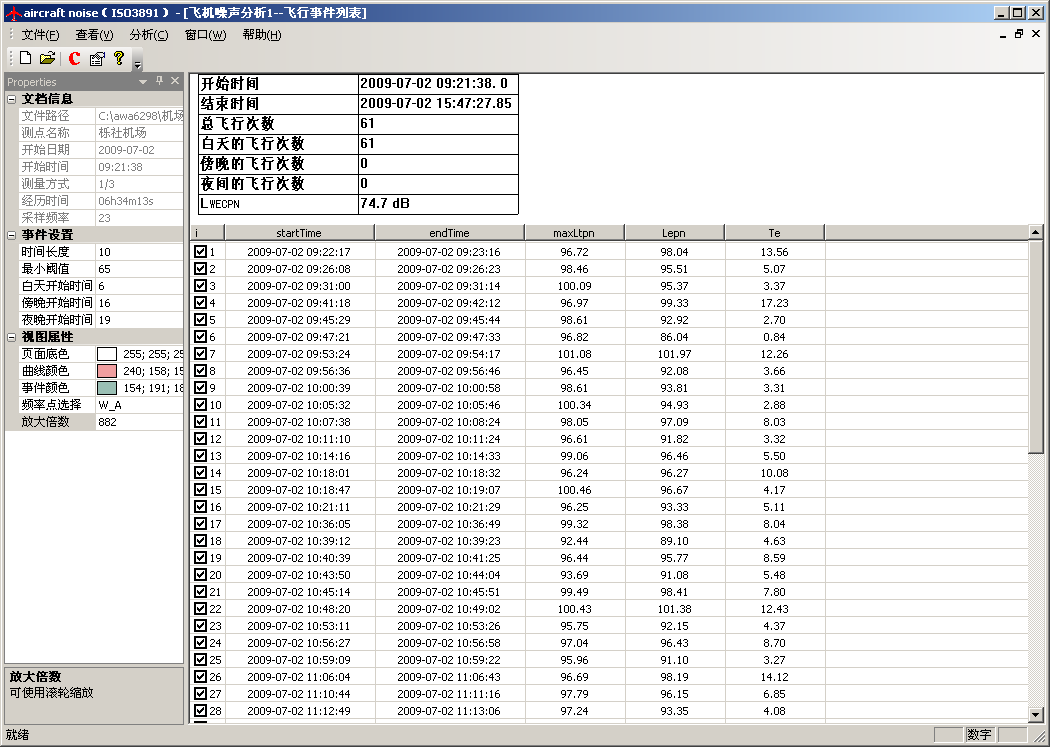 分析軟件可以根據(jù)用戶設(shè)定的判定依據(jù)自動判定出每一架次的飛行事件,按精密法或簡易法計算出每一架次的有效感覺噪聲級LEPN,再自動計算出全天的計權(quán)等效連續(xù)感覺噪聲級LWECPN。還可根據(jù)各測點的測量結(jié)果或預測結(jié)果自動繪制噪聲等值線圖,生成報告。