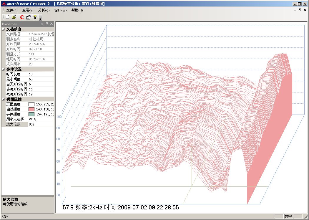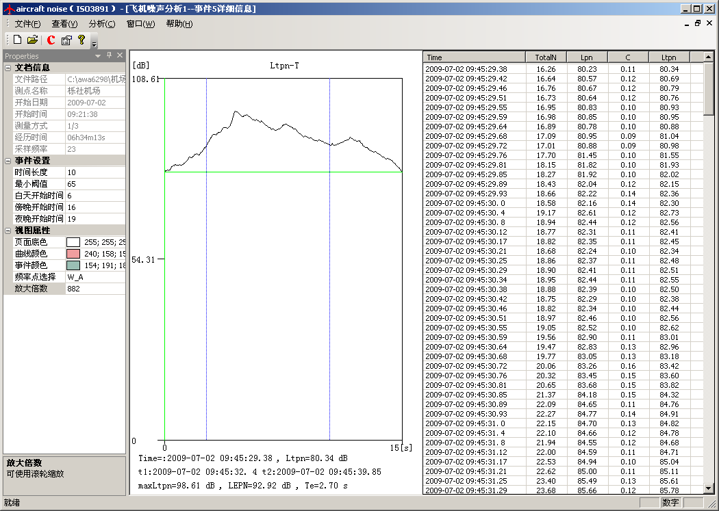 分析軟件可以根據(jù)用戶設(shè)定的判定依據(jù)自動判定出每一架次的飛行事件,按精密法或簡易法計算出每一架次的有效感覺噪聲級LEPN,再自動計算出全天的計權(quán)等效連續(xù)感覺噪聲級LWECPN。還可根據(jù)各測點的測量結(jié)果或預測結(jié)果自動繪制噪聲等值線圖,生成報告。
